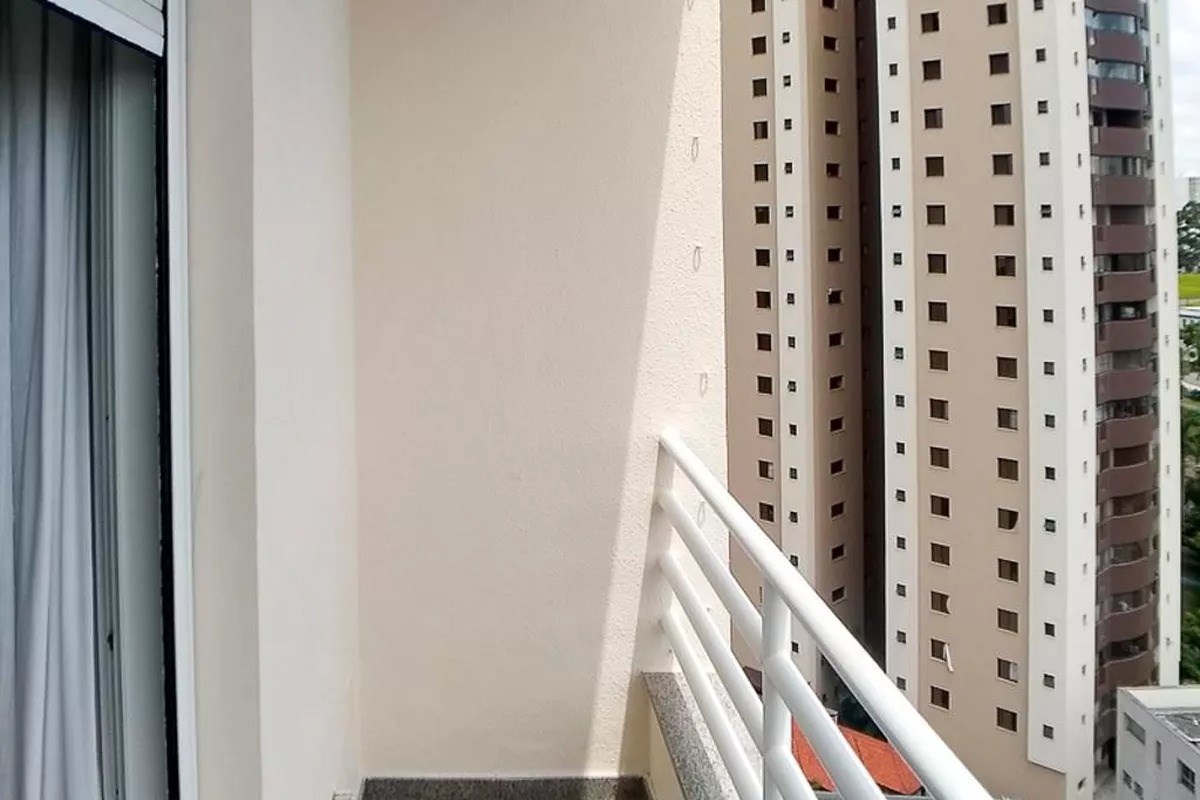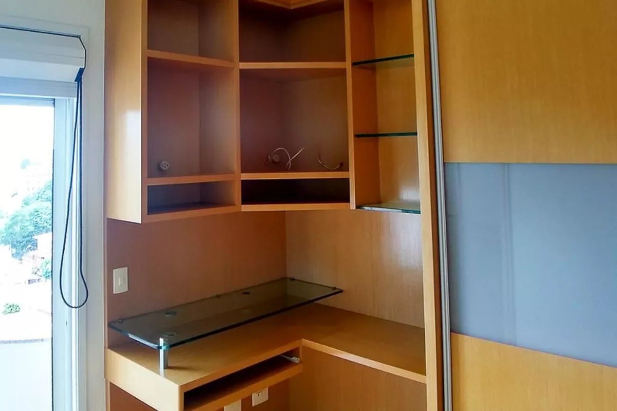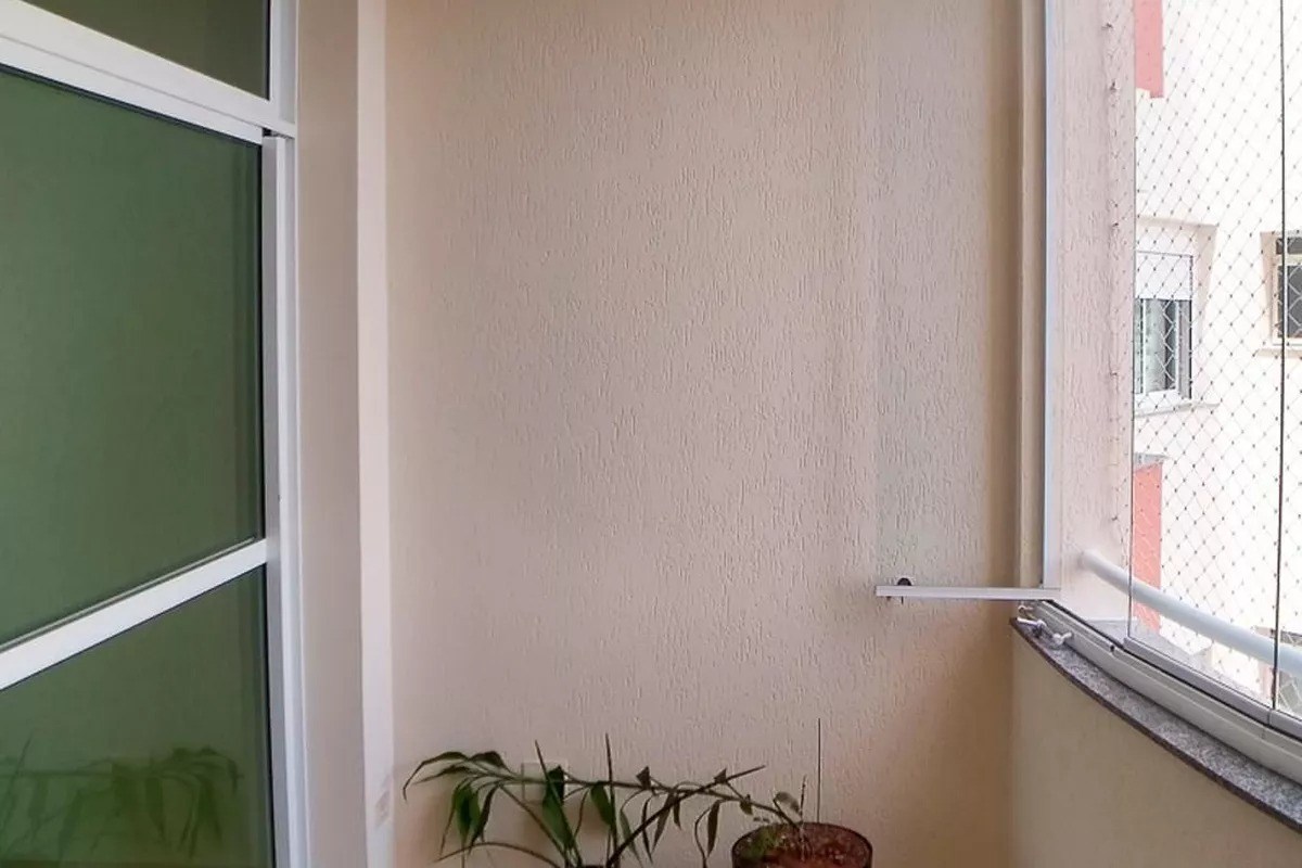 Varanda com fechamente em vidro e telas de proteção.