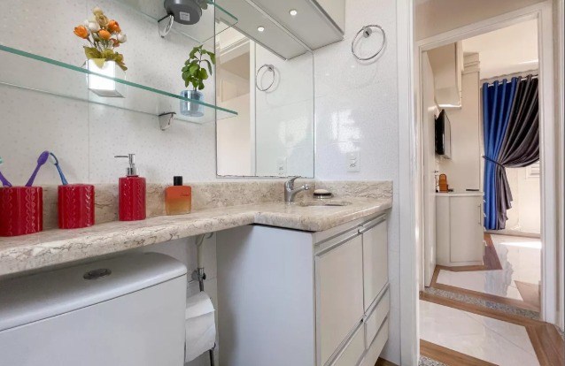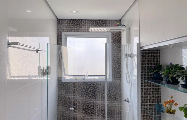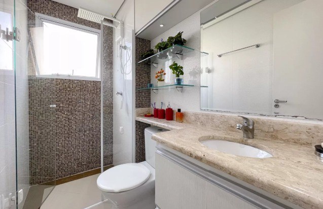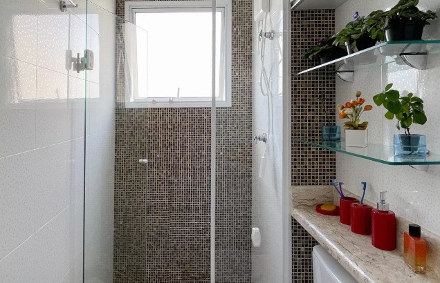 Banheiro com box em vidro.