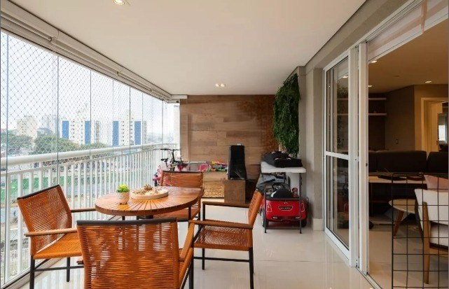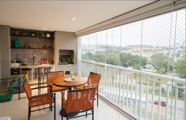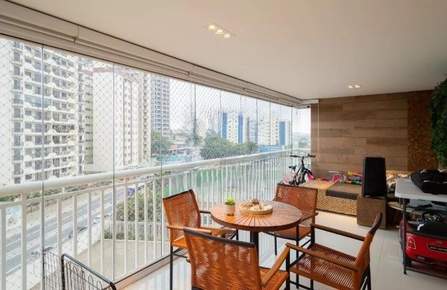 Varanda com fechamento em vidro e telas de proteção.