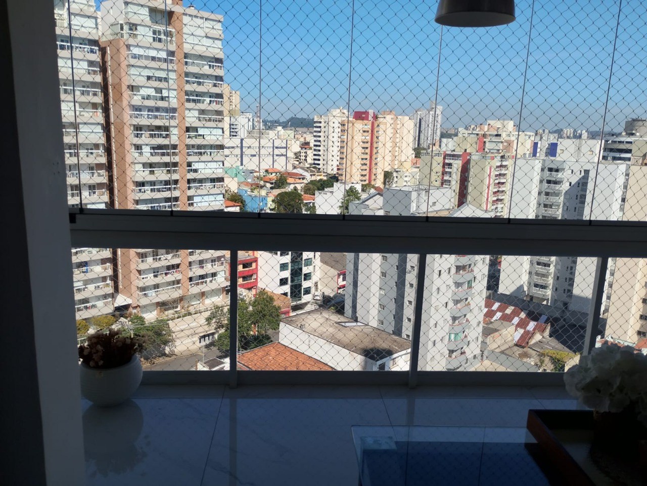 Varanda com fechamento em vidro e telas de proteção.