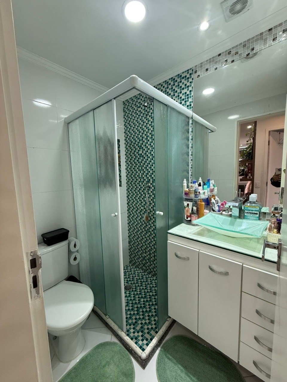 Banheiro com box em vidro.
