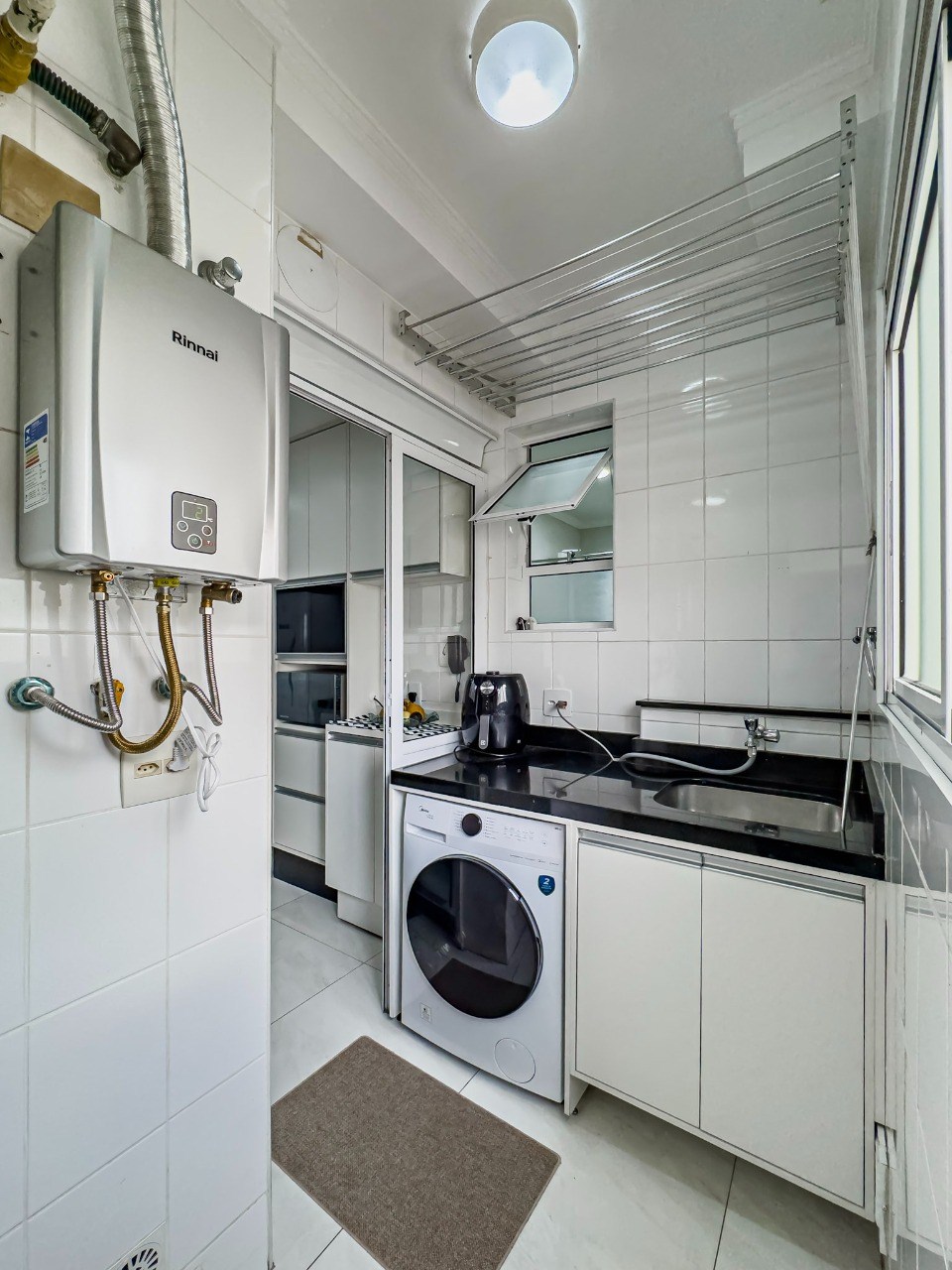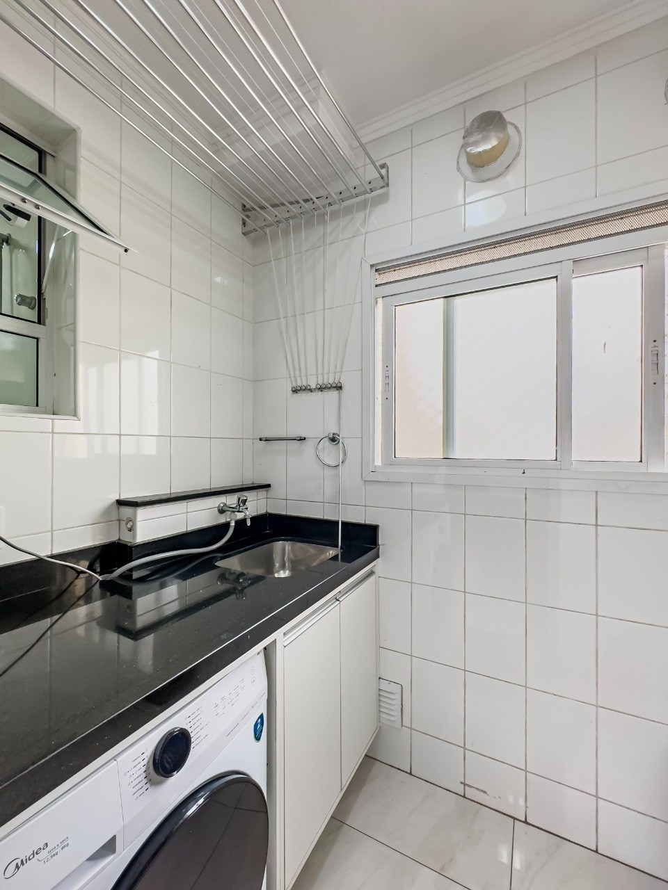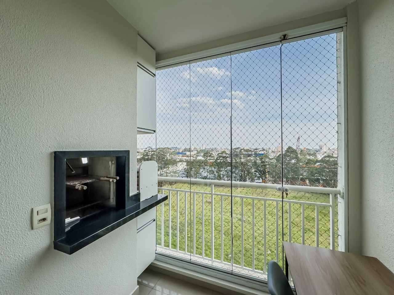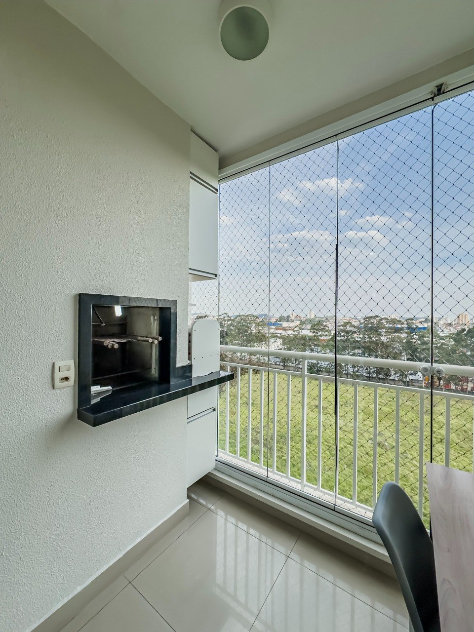 Varanda gourmet com fechamento em vidro e telas de proteção.