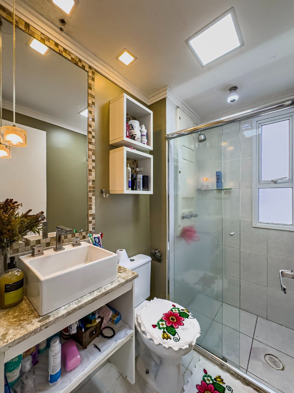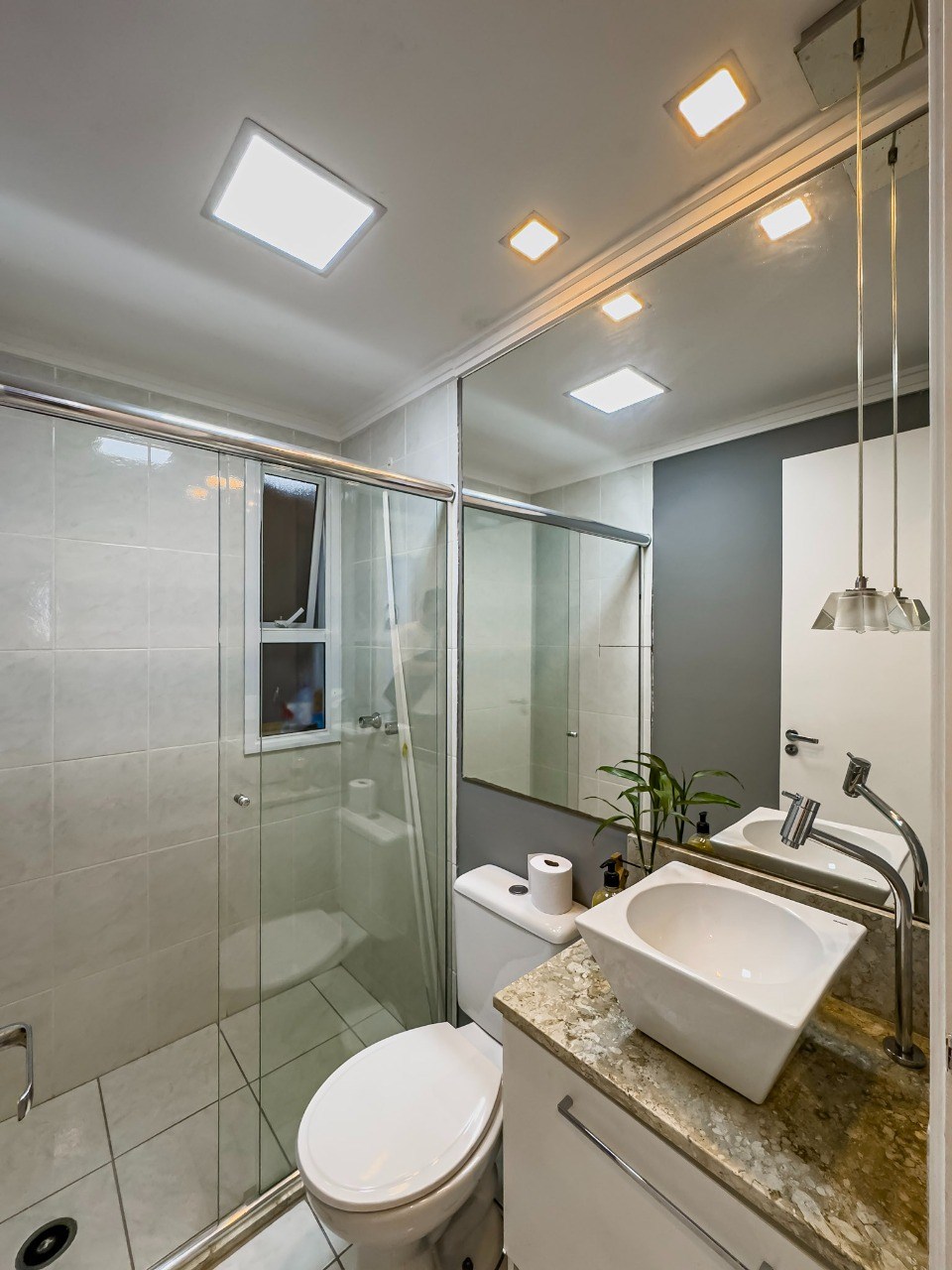 Banheiro com box em vidro.