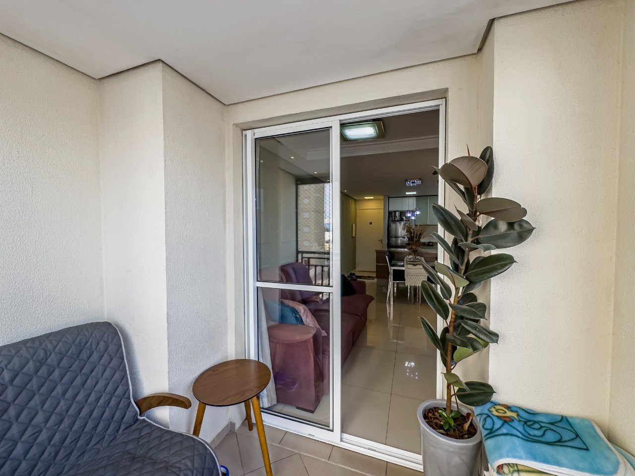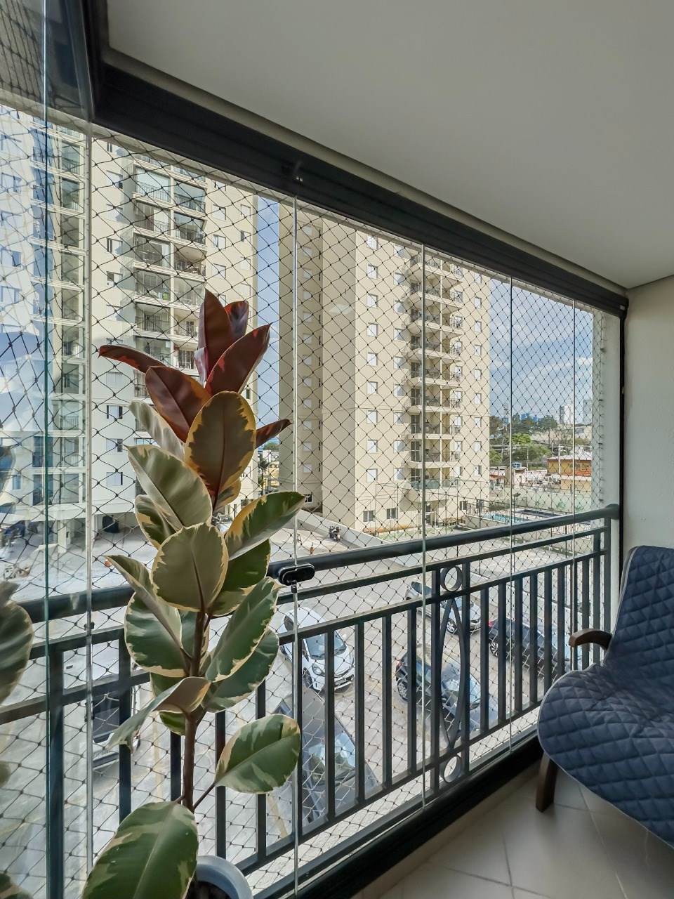 Sacada com fechamento em vidro e telas de protação.