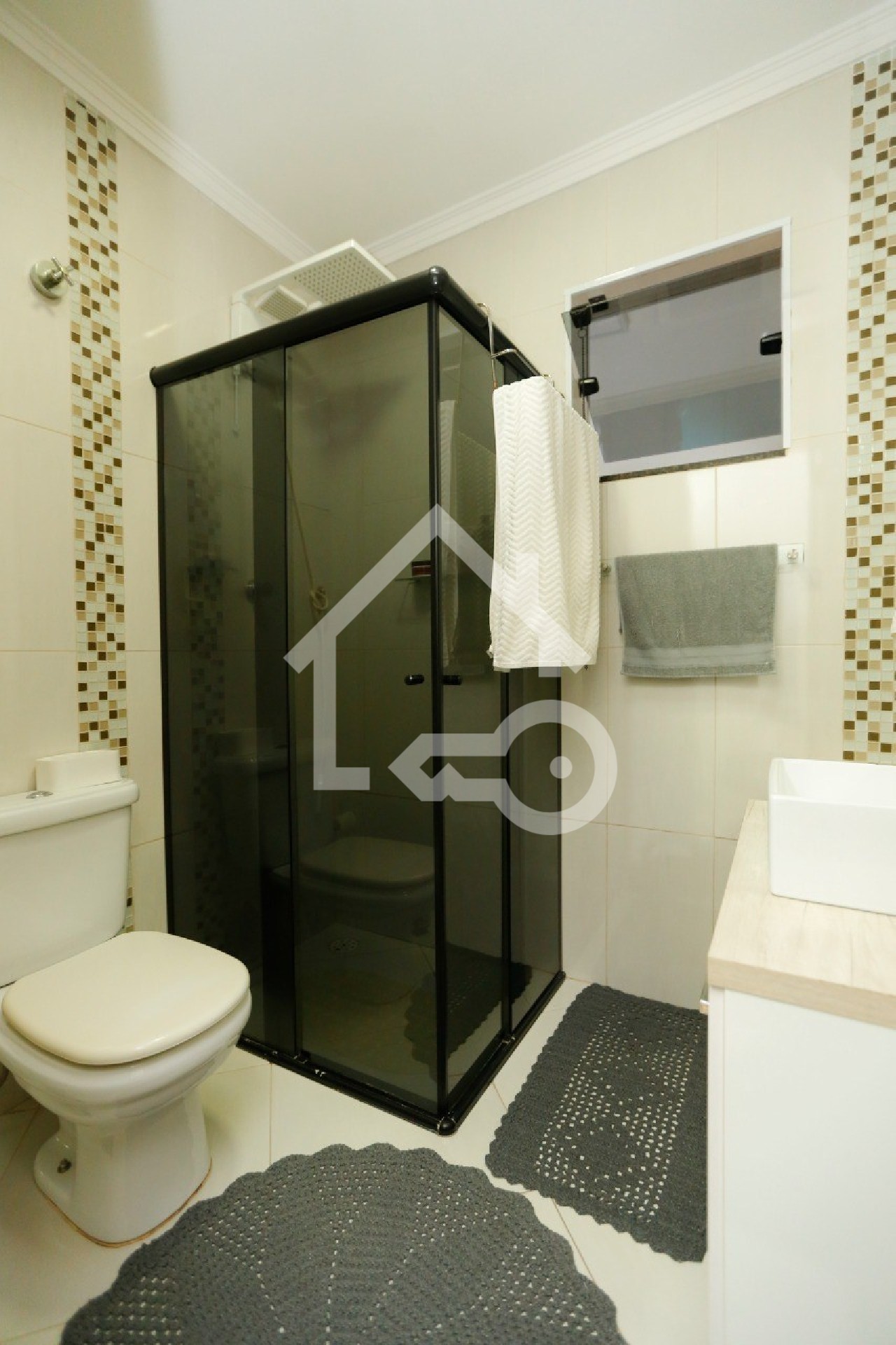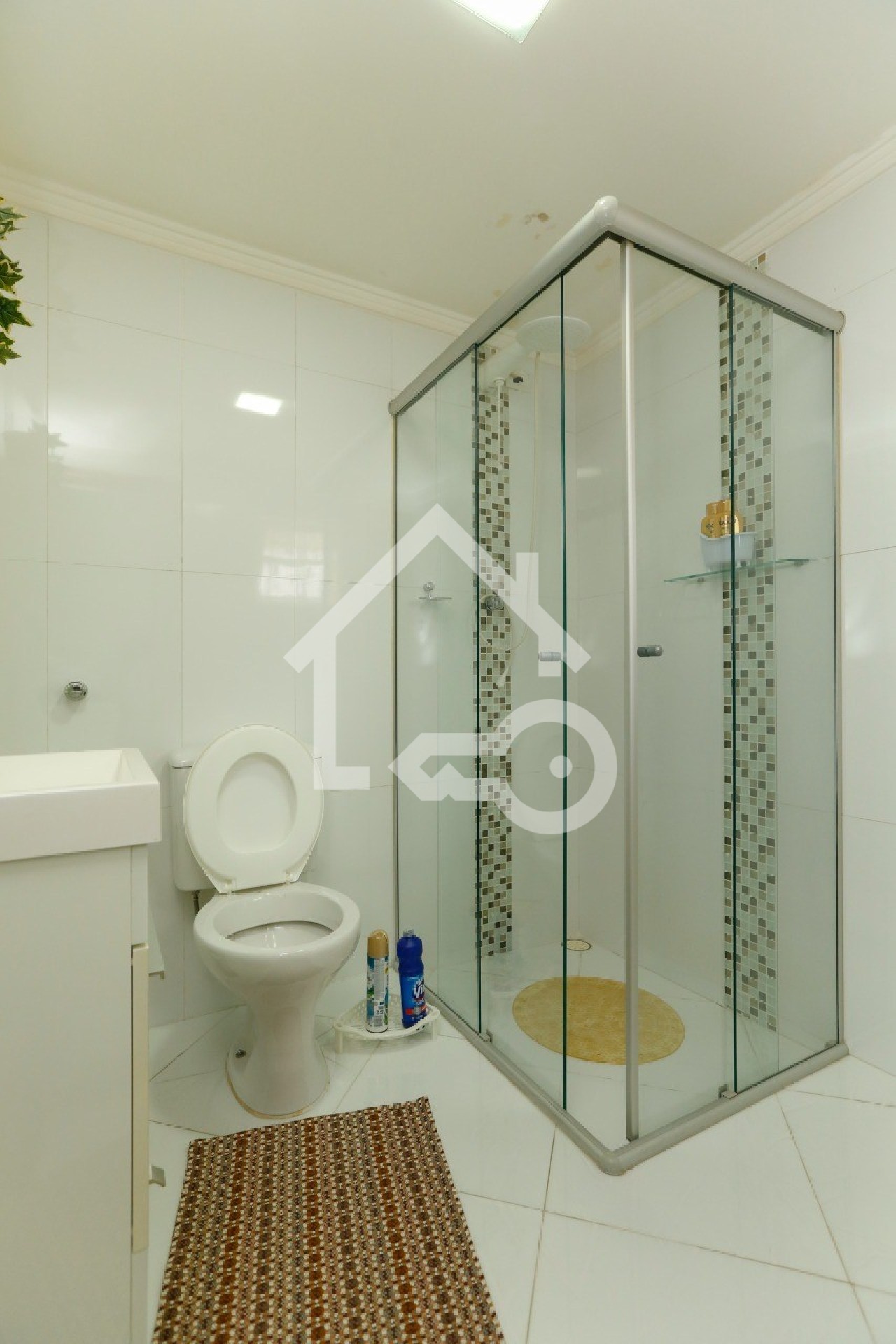 Banheiro com box em vidro.
