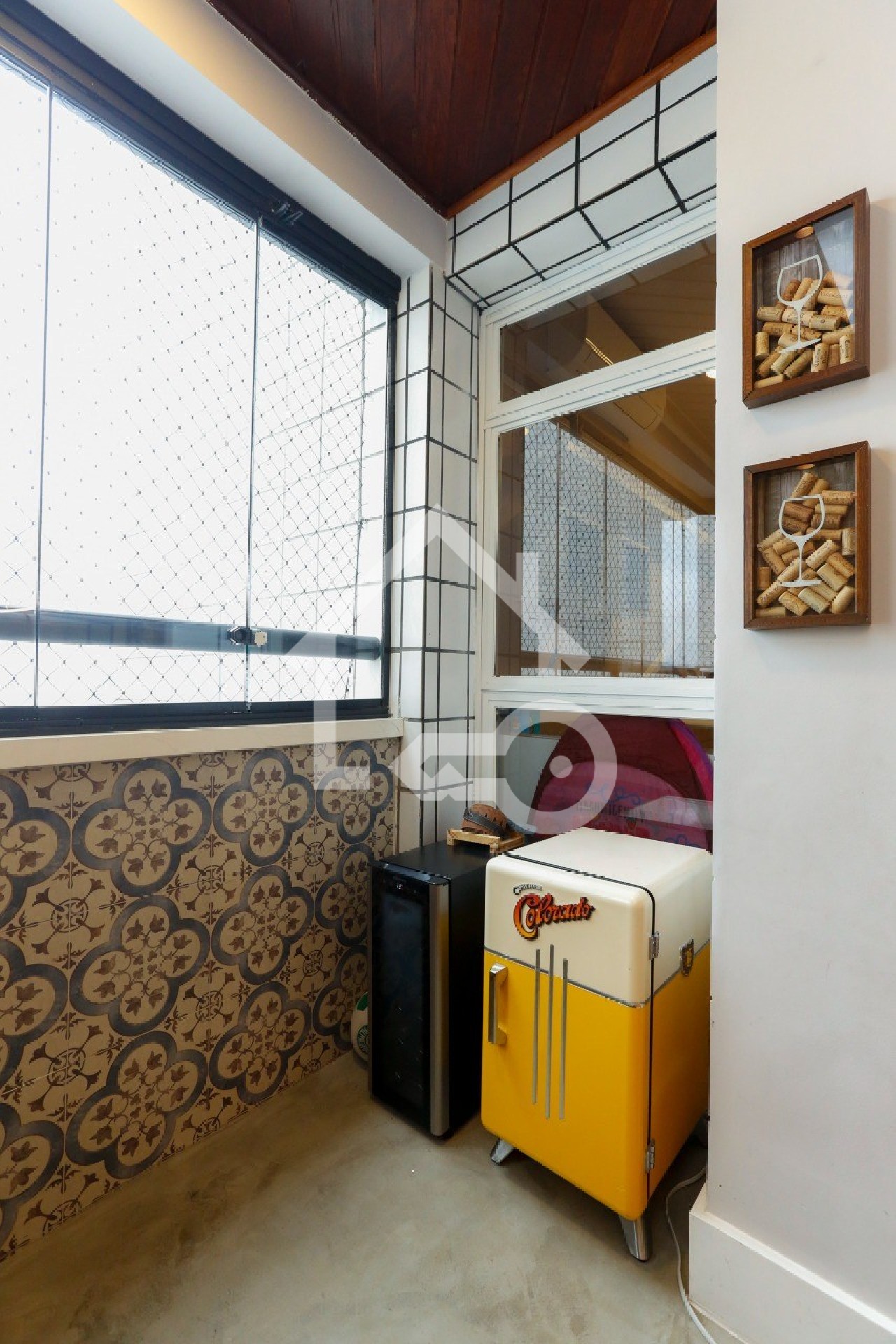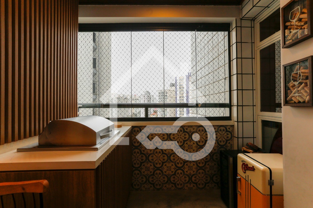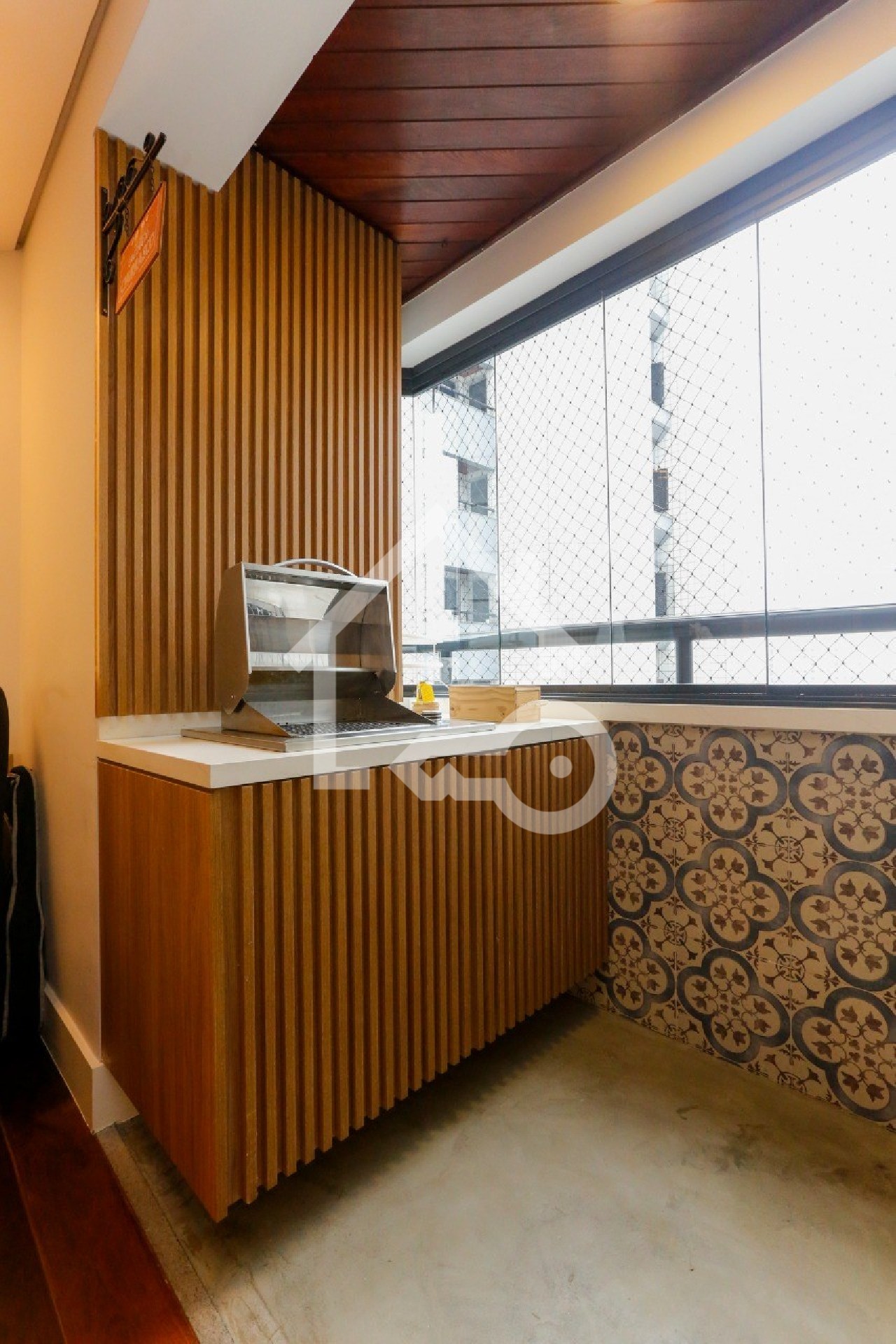 Sacada com área gourmet e fechamento em vidro.