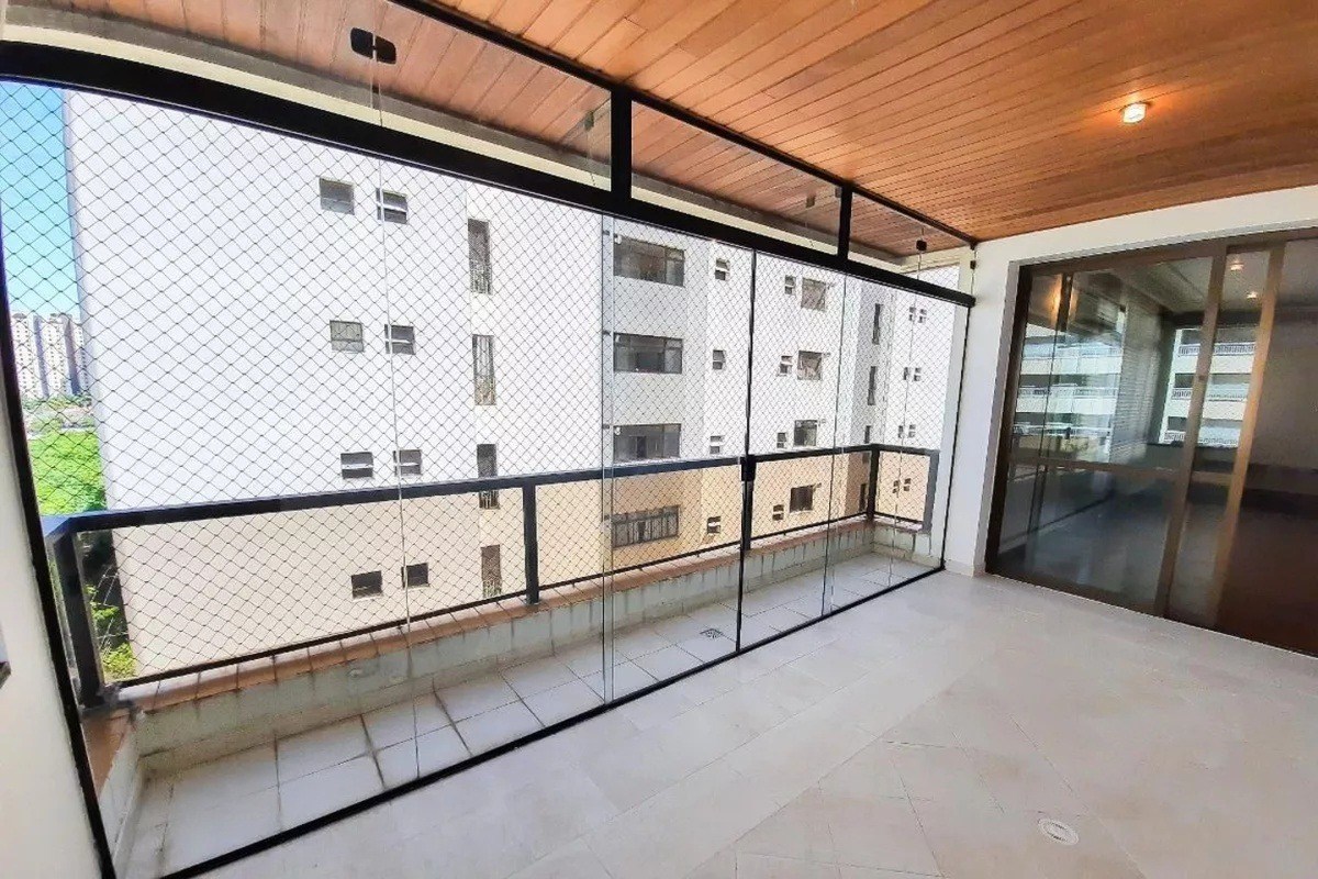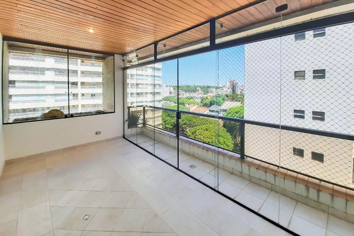 Varanda com fechamento em vidro e telas de proteção.