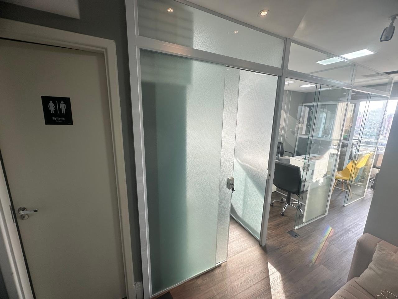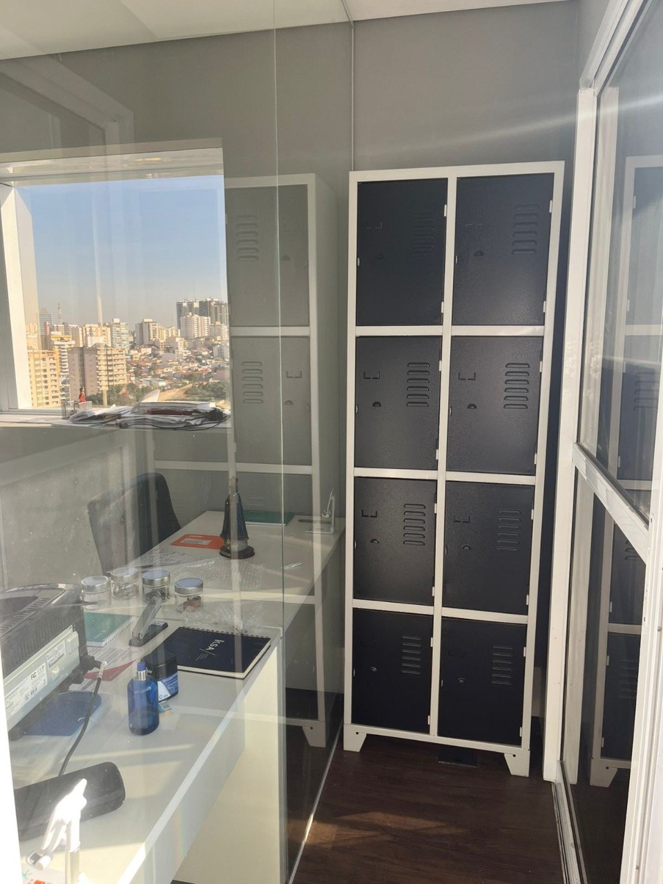 3 com divisórias de vidro.